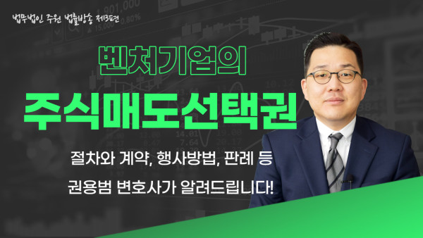 [법무법인 주원 법률방송] 벤처기업의 주식매도선택권(스톡옵션, 권용범 변호사) 2022-06-13 관련링크 https://youtu.be/BI6FgPoP9l0 안녕하세요.법무법인 주원 법률방송 입니다.스톡옵션이라고 불리우는 주식매도선택권에 대해 권용범 변호사가 쉽게 설명해 드립니다 ! 목록